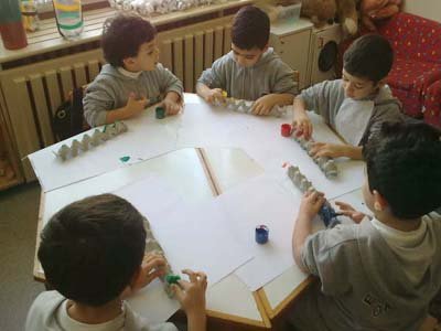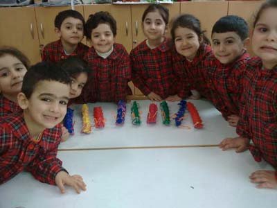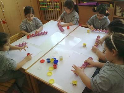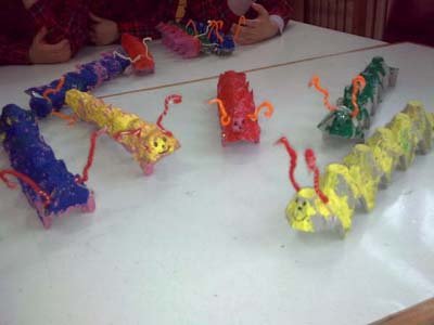 Kartonlarýmýzý kestikten sonra parmak boyasýyla boyadýk, antenlerini takýp sevimli týrtýllarýmýzý oluþturduk.