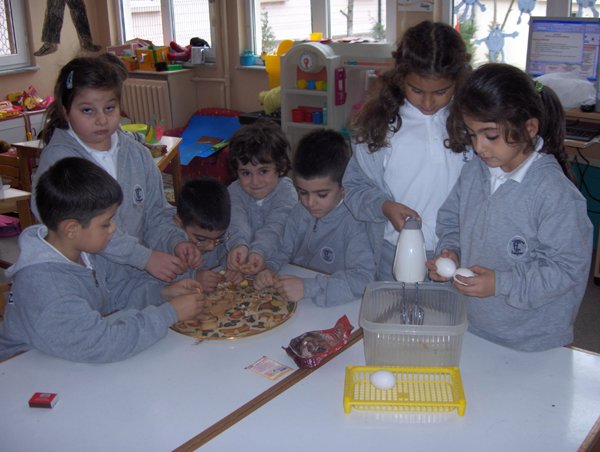 Bisküvileri onlar kýrdý, yumurtalarý da... Tümünü karýþtýrýnca mozik pastalarý oldu. Sonra da afiyetle yediler...
