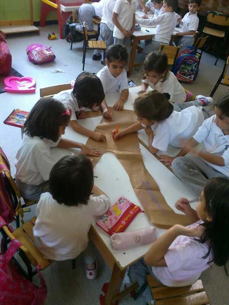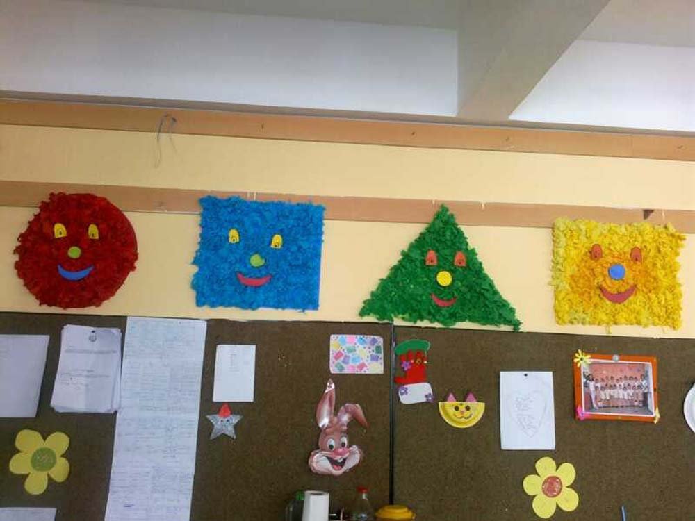 Krepon kaðýtlarýný yuvarlayarak geometrik þekiileri oluþturup, sýnýfýmýzýn duvarýnda sergiledik.