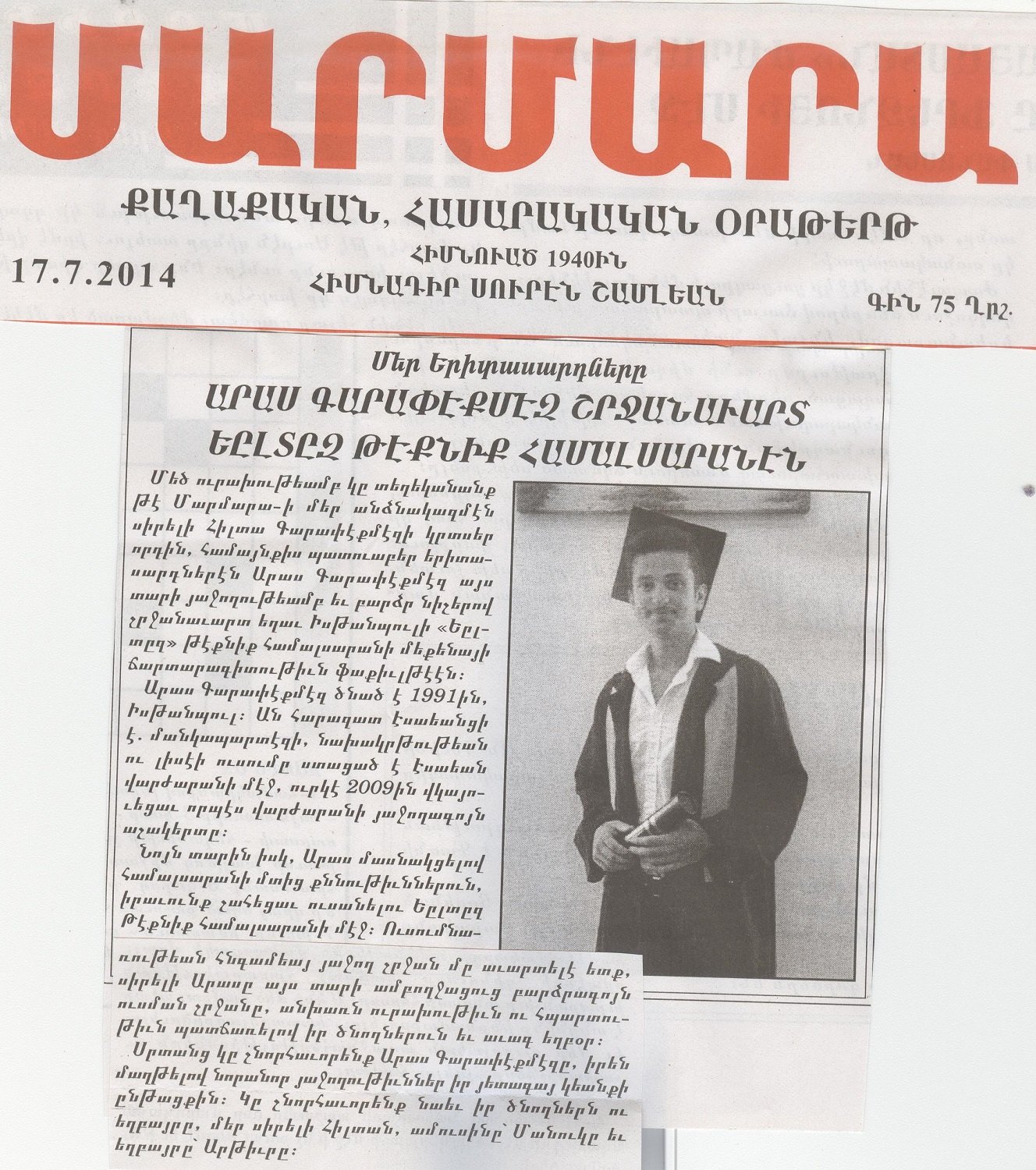 Okulumuz mezunlarýndan Sevan Kazancý Umut vakfýnýn düzenlediði yarýþmada birinci oldu. Sevan Kazancý 2003-2004 eðitim yýlýnda Esayan'dan mezun olup Marmara Üniversitesi Gazetecilik bölümüne girmeye hak kazanmýþtý. Esayan Ailesi olarak Sevan'ý kutluyor baþarýlarýnýn devamýný diliyoruz.