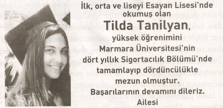 Okulumuz 2003-2004 mezunlarýndan Tilda Tanilyan üniversite eðitimini baþarý ile tamamlamýþtýr. Esayan Ailesi olarak kendisini kutluyor baþarýlarýnýn devamýný diliyoruz.